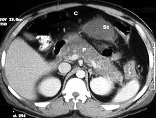 Post Contrast CT findings reveal diffusely enlarged pancreas with low density from oedema. C – colon, St – stomach,