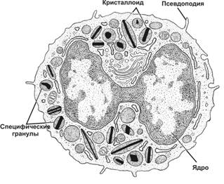 Рис. 6-5. Эозинофил.Ядро эозинофила обычно образует два крупных сегмента, соединённых тонкой перемычкой. Содержит умеренное количество типичных органелл, гликоген. Крупные гранулы овоидной формы содержат электроноплотный материал — кристаллоид. Клетка образует цитоплазматические выросты, при помощи которых мигрирует в тканях. [17]