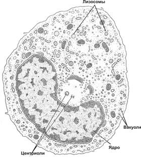 Рис. 6-7. Моноцит. Крупное бобовидное или подковообразное ядро расположено эксцентрично. Хроматин слабо конденсирован. В цитоплазме присутствуют типичные органеллы, много рибосом и полирибосом, пиноцитозные пузырьки, фагоцитарные вакуоли, многочисленные лизосомы. [17]