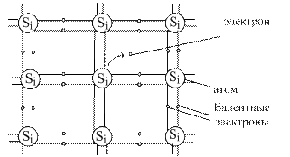 При температуре абсолютного нуля -273,16°С в кристалле чистого кремния свободных электронов нет, т.е. полупроводник, обладает свойствами диэлектрика. При температуре выше абсолютного нуля (или при нагревании, освещении, облучении и т.д.) прочность кристаллической решетки нарушается, и появляются электроны проводимости. Эти электроны порывают парно- электронные связи и становятся свободными (количество свободных электронов мало).