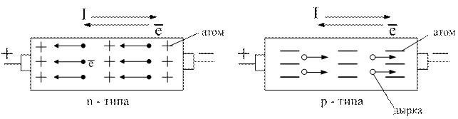 В полупроводнике n-типа, под действием ЭДС, в проводах и в самом полупроводнике движутся электроны проводимости. В полупроводнике p- типа, в проводах движутся электроны, в самом полупроводнике ток следует рассматривать как движение дырок.