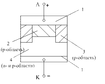 Рис. 5.2. Конструктивное исполнение лавинного вентиля: 1 - вольфрамовые пластины; 2 - область проводимости p-типа; 3 - защитное (охранное) кольцо;