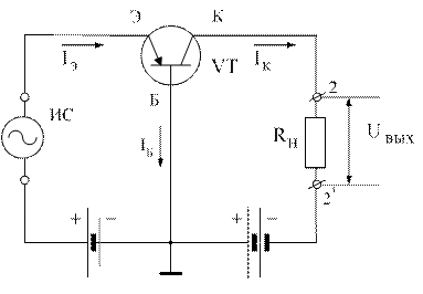 Источник сигнала (ИС) в этой схеме включается в цепь эмиттера, сопротивление нагрузки Rн – в цепь коллектора.