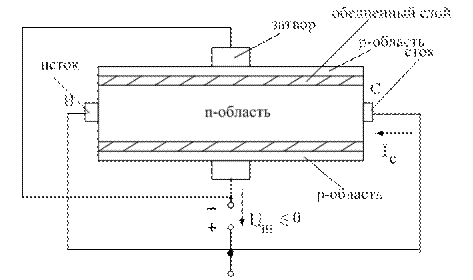 При подаче запирающего напряжения Uзи на p-n-переход между затвором и каналом на границах канала возникает равномерный слой, объединенный носителями зарядов и обладающий высоким удельным сопротивлением, а это приведет к уменьшению проводящей ширины канала.