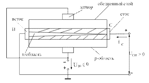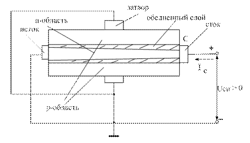 Напряжение, приложенное между стоком и истоком, приводит к появлению неравномерного обедненного слоя, так как разность потенциалов между затвором и каналом увеличивается в направлении от истока к стоку и, наименьшее сечение канала расположено вблизи стока.