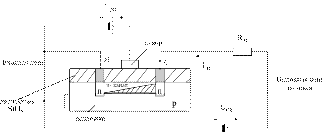 В исходной пластине чистого или слаболегированного кремния (p-типа), называемого подложкой, созданы области стока, канала и истока n-типа. Четвертый электрод, подложка, в большинстве схем соединяют с истоком (рис. 6.35). Подача управляющего напряжения Uзи на затвор транзистора, за счет создаваемого электрического поля в структуре транзистора, осуществляется управлением величины тока Iс.