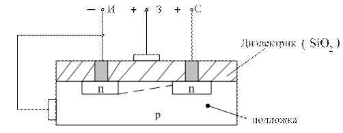 Канал проводимости тока в этом типе транзистора не создается, а индуктируется благодаря притоку электронов из p-области при приложении к затвору напряжения приложенной полярности. Транзистор с индуцированным каналом работает только в режиме обогащения.