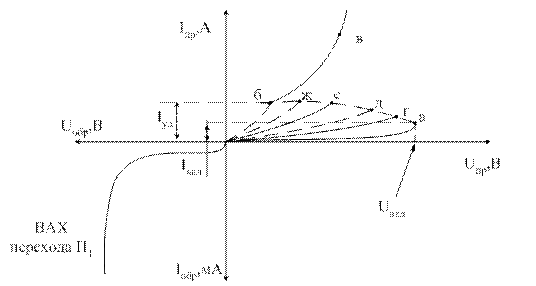 Обратная ветвь ВАХ тиристора представляет собой обратную ветвь ВАХ перехода П1 или диода. Именно на переходе П1 решается задача получения лавинной характеристики для защиты тиристора от перенапряжения.