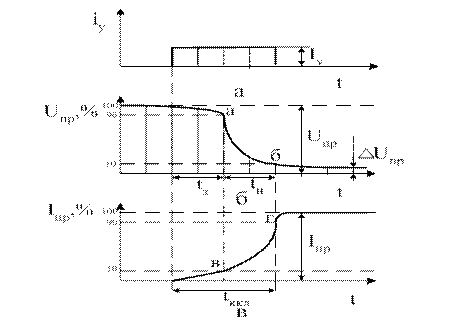 При подаче импульса управления (рис. 7.4, а) тиристор переходит из запертого состояния в открытое не мгновенно, так как для инжекции носителей электричества в слои p2 и n1 требуется определенное время. За время включения tвкл (рис. 7.4, б) принимают промежуток времени от момента подачи импульса до момента когда прямое напряжение Uпр уменьшается до 10% от первоначального значения.