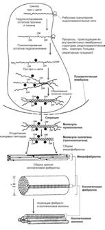 Взаимодействие коллагена с клетками (табл. 6-12). Коллагеновые волокна окружают многие клетки. Некоторые клетки (например, гепатоциты и ГМК) имеют рецепторы коллагена и прямо связываются с ним. Другие клетки связываются с коллагеном через специальные связующие белки-посредники (чаще фибронектин, реже хондронектин и ламинин).