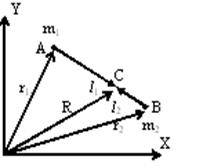 | Центром масс двух материальных точек А и В с массами и соответственно называется точка С, лежащая на отрезке, соединяющем А и В, на расстояниях и от А и В, (рис.5.1) обратно пропорциональных массам точек, т.е.