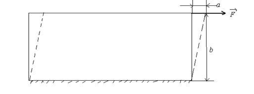 Рассмотрим деформацию сдвига. Возьмем однородное тело, имеющее форму прямоугольного параллелепипеда, нижнюю грань закрепим, а к его верхней грани приложим силу F,параллельную нижней грани.