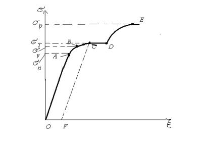 Предел упругости практически совпадает с точкой В. За пределом упругости в теле возникают остаточные деформации и график, описывающий возвращение тела в первоначальное состояние после прекращения действия силы, изобразится не кривой ОВ, а параллельной ей – СF. Фигура OABCFO называется областью упругого гистерезиса. Напряжение, при котором появляется заметная остаточная деформация (
