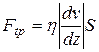 Таким образом, при движении двух погруженных в жидкость пластин относительно друг друга между ними возникает взаимодействие, характеризуемое силой (9.10). Воздействие пластин друг на друга осуществляется через жидкость, заключенную между пластинами, передаваясь от одного слоя жидкости к другому. Если исследовать скорость частиц жидкости в разных слоях, то оказывается, что она изменяется в направлении z , перпендикулярном к пластинам, и по линейному закону