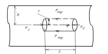 При стационарном течении в трубе постоянного сечения скорости всех частиц жидкости остаются неизменными. Следовательно, должна быть равна нулю сумма проекций на направление оси трубы всех сил, действующих на цилиндр, т.е.