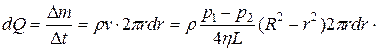 Полагая течение ламинарным, вычислим поток жидкости Q , т.е. количество жидкости m, протекающей через поперечное сечение трубы за единицу времени t:
