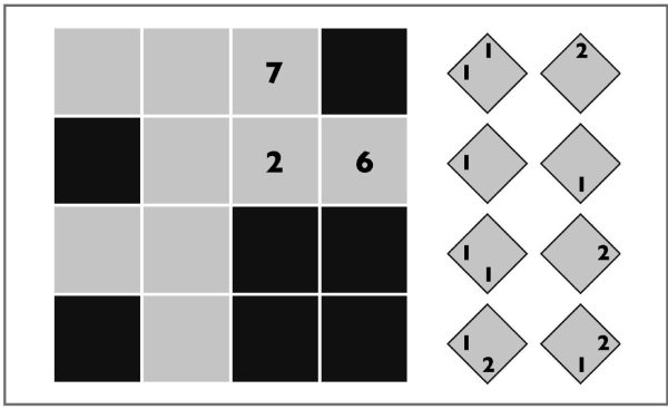 Испытайте свои силы, вновь пытаясь решить «навигаторскую» задачку (см. задачу 10). Как и в первый раз, вы должны разместить числа от 1 до 9 в решетке так, чтобы можно было шагать с одного числа на следующее по порядку, используя предложенные «лесенки»-подсказки. Каждую подсказку можно использовать один раз. Необходимо использовать обе части «лесенки», но делать это можно в любом порядке.