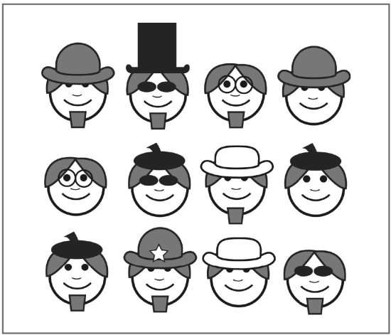 Это упражнение на узнавание – хороший способ проверить (и развить) способность подмечать детали и кратковременную память. Вы должны изучить ряд «фотороботов» в течение 1 минуты, затем закрыть книгу и ответить на вопросы, приведенные ниже. Представьте себя на очной ставке в полицейском участке. Как они похожи, эти подозреваемые, – с ума сойти!