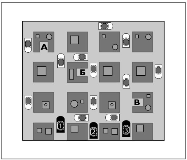Это повтор нашей логической задачи «Центральная парковка» (см. задачу 20). Однако на сей раз три темные машины, въезжающие в центральный район – это не лимузины мафиози, а полицейские автомобили без опознавательных знаков – они «висят на хвосте» у мафии.