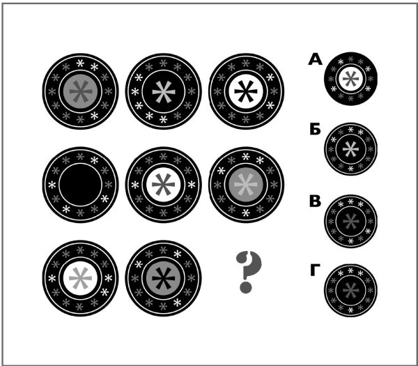 Представьте, что эти тарелки были найдены в антикварном магазине. Я хотел бы расставить их в логическом порядке, но не могу понять, какую из четырех (А, Б, В или Г) поставить на девятое место.