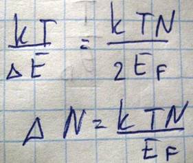Каждый электрон подвергающийся тепловому возбуждению поглощает энергию порядка kT¸как для обычного газа. Более строгий расчет дает выражение для теплоемкости