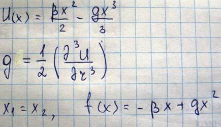 При смещении частицы 2 вправо x>0, а когда влево, то x<0. Несимметричный характер потенциальной кривой означает, что колебание частицы 2 вправо и влево являются разными, т.е. вправо частица отклоняется больше чем влево. Вследствие этого среднее положение частицы 2 также смещается вправо, а это означается увеличение расстояния между атомами, т.е. увеличение размеров тела. Произведем теперь оценку теплового расширения α, для этого найдем