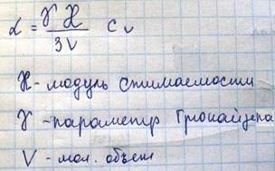 Таким образом, коэффициент линейного теплового расширения оказывается пропорциональным теплоемкости тела. Опыт подтверждает, что в области высоких температур (т.е. выше температуры Дебая) коэффициент линейного теплового расширения не …(закон Дюлонга-Пти для теплоемкости). В области низких температур коэффициент линейного теплового расширения с понижением температуры уменьшается пропорционально T3 (закон Дебая). При приближении к абсолютному нулю коэффициент линейной теплоемкости стремится к нулю. Впервые выражение для коэффициента линейной теплоемкости металлов было получено Грюнайзеном и имеет вид: