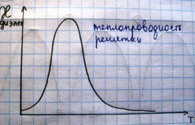 В области низких температур концентрация фононов резко уменьшается при понижении температуры, что приводит к возрастанию длины свободного пробега λср, которая в переделе стремится к размерам кристалла и уже не зависит от температуры, поэтому в области низких температур теплопроводность решетки пропорциональна теплоемкости решетки, т.е. Т3- закон Дебая