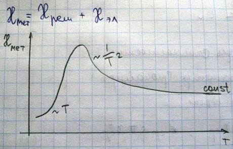 Каждый электрон, проходя по проводнику, попадая в один из таких дисков, будет испытывать рассеяние и при прочих равных условиях, вероятность попадания электронов в такой диск λ~1/S~1/a2. Как известно, энергия колеблющегося атома пропорциональна E~a2~T, поэтому в области высоких температур длина свободного пробега электрона обусловлена рассеянием на фононах λ~1/T. Если принять что число столкновений равным 1, то σ~T-1/T1/2=T3/2- для невырожденного газа. Для вырожденного σ~T-1/const=T-1. В области низких температур основное значение имеет рассеяние на ионизованных примесных атомов, и рассеяние состоит в том что ионы примеси отклоняют электроны пролетающие мимо них и тем самым, уменьшают скорость электронов в заданном направлении