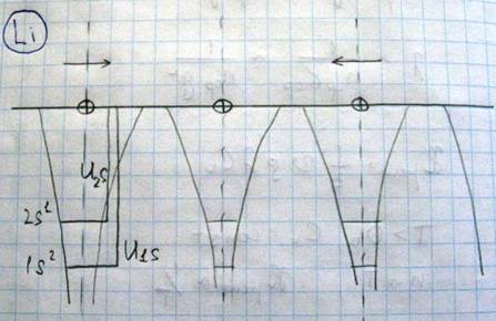 В твердом теле расстояние между атомами настолько малы (10-10), что каждый из атомов оказывается в достаточно сильном поле соседних атомов. Для того, чтобы проследить, какое влияние оказывает это поле на энергетические уровни рассмотрим идеализированный пример