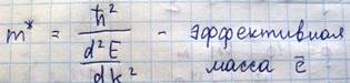 -эффективная масса электрона. Приписывая электрону находящемуся в периодическом поле кристалла, массу m* можно уже считать электрон свободным и описывать его движение во внешнем поле так, как описывается движение в случае свободного электрона. Из этой формулы видно что эффективная масса зависит от знака производной энергии по k- волновому вектору. И она может быть как положительной так и отрицательной