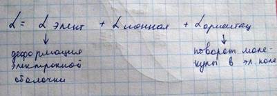 Вне полярных молекулах и кристаллах механизм поляризуемости аналогичен электронному механизму поляризуемости атома, и в первом приближении поляризуемость вещества равна сумме поляризуемостей отдельных атомов, для неполярных молекул. В полярных молекулах содержатся ионы с несовпадающими центрами тяжести положительных и отрицательных зарядов, следовательно, они обладают собственным дипольным моментом и собственный дипольный момент молекулы в этом случае равен векторной сумме составляющих дипольных моментов. Если такое вещество поместить в электрическое поле, то возможны три основных механизма поляризации: 1) электронная поляризуемость атомов и ионов, составляющих молекулы или кристалл; 2) ионная поляризуемость связанная с удалением друг от друга противоположно заряженных ионов; 3) ориентационная поляризуемость связанная с поворотом молекул в электрическом поле. В общем виде для веществ с полярными молекулами