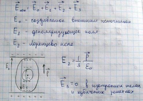 В этом выражении последнее слагаемое сильно возрастает с понижением температуры, поскольку тепловое движение молекул, которое пропорционально температуре, нарушает упорядоченное расположение молекул. Расчет действующего на атом или ион электрического поля обусловленного поляризацией образца в целом является одной из важнейших задач в теории диэлектриков. Предположим, что образец имеет форм эллипсоида вращения, одна из осей которого направлена параллельно направлению внешнего электрического поля. В этом случае так называемое локальное поле может быть вычислено по следующей формуле