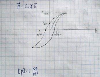 Поле, создаваемое в месте нахождения атома или иона зарядами, находящимися на поверхности воображаемой полости E2. В случае Е3=0 – случай в изотропных телах и кубических решетках. Изменить состояние поляризации диэлектрика можно не только за счет внешнего электрического поля, но также и за счет внешних механических деформаций изменяющих величину и направление элементарных диполей, такие вещества называются пьезоэлектриками. Вещества, у которых даже в отсутствие внешнего электрического поля существует самопроизвольный(спонтанный) электрический дипольный момент, то есть центр тяжести отрицательного заряда не совпадает с центром тяжести положительного заряда, называются сегнетоэлектриками. В таких кристаллах соседние диполи стремятся ориентироваться параллельно друг другу вследствие взаимодействия между собой, причем это стремление передается в кристалле от атома к атому, так что целый макроскопический области называемые доменами обладают суммарной спонтанной поляризацией в заданном направлении. Поляризация p в сегнетоэлектриках зависит от внешнего электрического поля нелинейно и следовательно диэлектрическую восприимчивость таких материалов определить достаточно сложно. Наиболее характерной особенностью сегнетоэлектриков является своеобразная зависимость поляризации от напряженности внешнего электрического поля называемая петлей гистерезиса