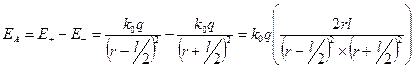 Воспользовавшись принципом суперпозиции электрических полей, вычислим поле на оси диполя в точке А, отстоящей от центра диполя на расстоянии r >> l (рис. 1.11.). Электрическое поле в рассматриваемой точке возникает как результат сложения двух полей, созданных точечными зарядами +q и –q.