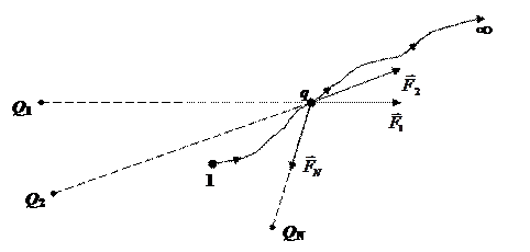 При перемещении заряда q из точки 1 в бесконечность электрическая сила совершит работу, равную алгебраической сумме работ сил, действующих на движущийся заряд со стороны зарядов Q1, Q2, …, QN (рис. 3.3.):