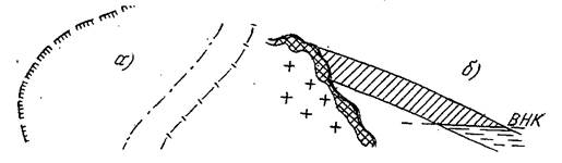 Рис. 1.3. Литологически ограниченная заливообразная нефтяная залежь в плане (а) и разрезе (б): + – породы фундамента; # – кора выветривания