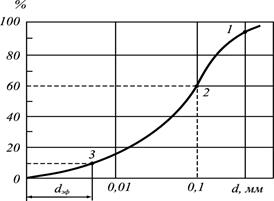По построенной интегральной кривой определяют две важные величины: коэффициент однородности (неоднородности) и так называемый действующий диаметр или эффективный размер зерен (dЭф).