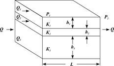 Рис. 1.17. Линейная фильтрация в пласте, состоящем из нескольких изолированных пропластков различной мощности и проницаемости