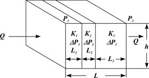 Рис. 1.18. Линейная фильтрация через пласт, имеющий несколько последовательно расположенных зон различной проницаемости