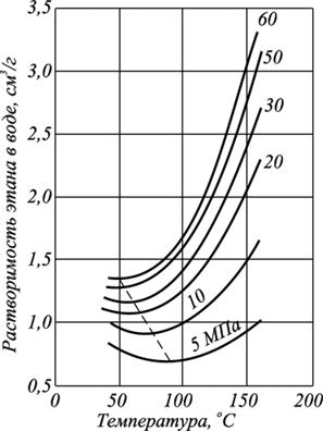 Растворимость газа зависит от температуры. С увеличением температуры растворимость углеводородов в воде вначале уменьшается, а затем возрастает, пройдя через максимум (рис. 2.9). Причем температура минимальной растворимости различных газов возрастает с увеличением размера молекулы газа. Температура минимальной растворимости газов зависит от давления.