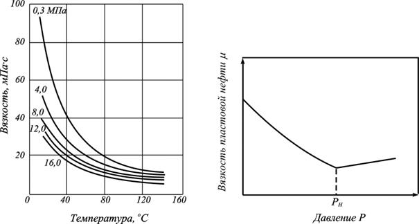 Минимальная величина вязкости имеет место, когда давление в пласте становится равным пластовому давлению насыщения (рис. 3.4. б).