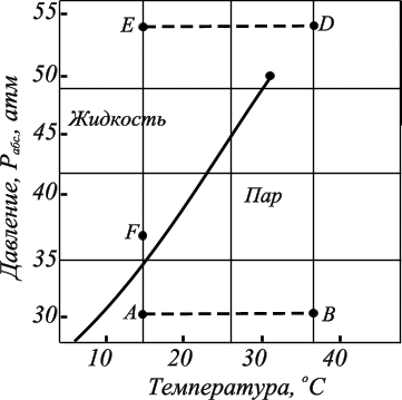 Из рисунка 4.2 следует, что путём соответствующих изменений давления и температуры углеводороды можно перевести из парообразного состояния в жидкое, минуя двухфазную область. Газ, характеризующийся параметрами точки А (рис. 4.2), можно изобарически нагреть до температуры точки В, а затем, повысив давление в системе при постоянной температуре, перевести вещество в область точки D, расположенную выше критической точки С, и далее в область точки Е. Свойства системы при этом изменяются непрерывно, и разделения углеводорода на фазы не произойдёт. При дальнейшем охлаждении системы (от точки D до точки Е), а затем при снижении давления до точки F вещество приобретёт свойства жидкости, минуя область двухфазного состояния.