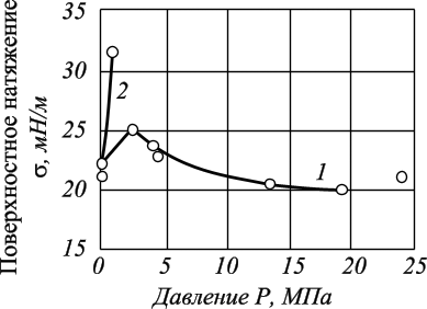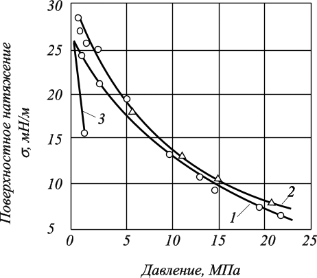 Сложный характер имеет зависимость поверхностное натяжение на границе с водой от давления и температуры в условиях насыщения нефти газом (рис. 6.3). Это обусловлено изменением концентрации полярных компонентов в поверхностном слое нефти при растворении в ней газа.