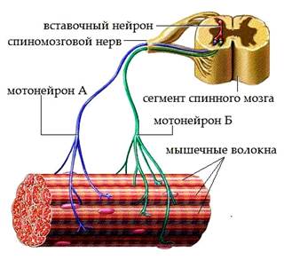 Иннервация поперечно-полосатых мышечных волокон позвоночных осуществляется из мотонейронов спинного мозга или мозгового ствола, при этом один мотонейрон коллатералями своего аксона иннервирует несколько мышечных волокон. Комплекс включающий двигательный нейрон и иннервируемую им группу мышечных волокон называется двигательной (нейромоторной) единицей (ДЕ) (Рис. 1), она, напомним, является основным структурно-функциональным элементом нервно мышечного аппарата. Практически, весь нервно мышечный аппарат можно рассматривать как совокупность двигательных единиц, каждая из которых работает как единое целое – импульсы, посылаемые мотонейроном, приводят в действие все входящие в её состав мышечные волокна одновременно.