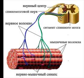 Вспомним, что функциональной единицей двигательного аппарата является нейромоторная (двигательная) единица – комплекс из мотонейрона (двигательного нейрона) и группы мышечных волокон, с которыми нейрон связан через синапс, и сокращение которых запускает. (Рис. 1). Для понимания механизма развития утомления следует выяснить меру участия каждой из этих структур, что можно сделать, поочерёдно исключая элементы двигательных единиц из сократительного процесса. Такими элементами будут: нервный центр, двигательный нейрон, нейромышечный (мионевральный) синапс и мышечные волокна.