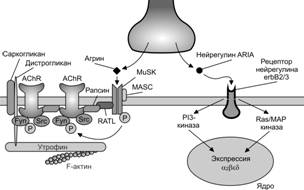 Рис. 7-12. Роль аксона в созревании постсинаптической мембраны. Из нервной терминали в синаптическую щель секретируются нейрогенные молекулы. Нейрегулин (ARIA) стимулирует экспрессию генов дефинитивной формы холинорецепторов (2), а агрин, активируя MuSK,способствует кластеризации рапсина, взаимодействующего с холинорецепторами и белками цитоскелета постсинаптической мембраны. [74]