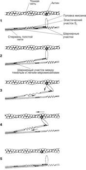 Модель скользящих нитей была предложена Хью Хаксли. Скольжение тонких нитей относительно толстых обеспечивает чередование рабочих циклов. Каждый цикл имеет несколько стадий (рис. 7-15).