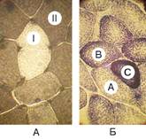 Рис. 7-16А. Типы волокон скелетной мышцы. Гистохимическое выявление активности АТФазы миозина и сукцинатдегидрогеназы (СДГ).A (слева) — активность АТФазы миозина: тип I — медленносокращающиеся; II — быстросокращающиеся. Б (справа) — активность СДГ: А — белое (гликолитическое); B — промежуточное (окислительно-гликолитическое); C — красное (окислительное).
