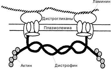 Дистрофин и мышечные дистрофии. Существует ряд наследственных заболеваний, при которых нарушено обновление скелетной мышечной ткани. Мышечная дистрофия Дюшенна — Х-сцепленный дефект (чаще делеция) гена дистрофина. При этом резко уменьшен или отсутствует синтез дистрофина (рис. 7-19), что сопровождается потерей других белков дистрофин-дистрогликанового комплекса, особенно дистрогликанов, и нарушением связей цитоскелета с межклеточным матриксом. Мышечные волокна теряют структурную целостность и при сокращении подвергаются дегенерации. Активированные клетки-сателлиты на месте погибших мышечных волокон образуют новые. Продолжающиеся циклы дегенерации и регенерации мышечной ткани приводят к истощению пула клеток-сателлитов, что сопровождается замещением мышечной ткани жировой. Значительные двигательные расстройства, развивающиеся ко второму десятилетию жизни, ограничивают самостоятельное передвижение больных. Смерть наступает на втором или третьем десятилетии жизни, часто в результате пневмонии.